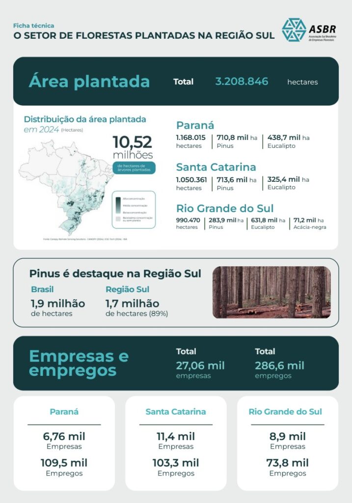 No total, Paraná, Santa Catarina e Rio Grande do Sul somam 3,2 milhões de hectares de florestas plantadas, considerando pinus, eucalipto, acácia e outros gêneros. Santa Catarina lidera a área de pinus na região, com 713,6 mil hectares, seguida de perto pelo Paraná, com 710,8 mil hectares. O Rio Grande do Sul possui 283,9 mil hectares.