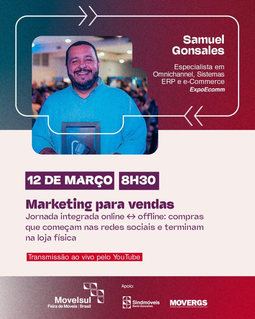 A primeira palestra será realizada em parceria com a ExpoEcomm e contará com Samuel Gonsales, especialista em Omnichannel, Sistemas ERP e e-Commerce, trazendo uma abordagem estratégica sobre integração de canais e competitividade no varejo.